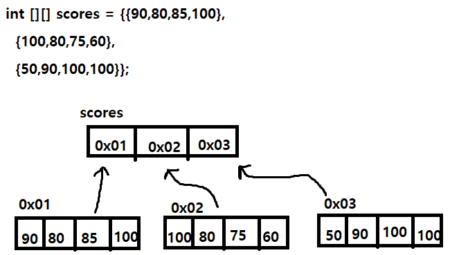 ex. 2차원배열 int scores[][] → 1차원 배열의 주소값을 원소로 갖는 배열