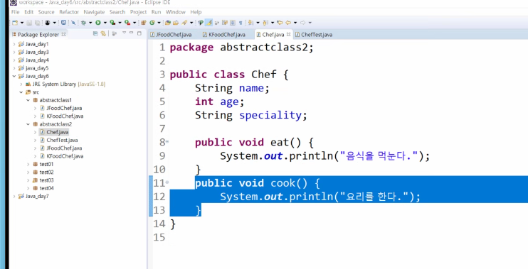 ⇒ cook() 메서드는 자손클래스에서 반드시 재정의해서 사용되기 때문에 조상의 구현이 무의미함