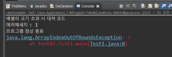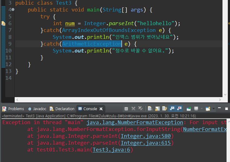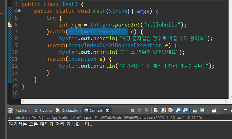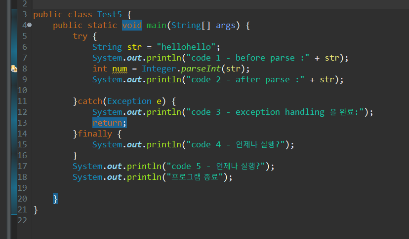 ⇒ 8번라인에서 에러가 터져서 11번라인에 걸려서 12번 라인이 실행된다. 즉, 9번과 10번라인은 아예 실행되지 않으므로, return을 만나서 메인메소드가 종료되지 않고 나머지 코드들이 실행되는 것.