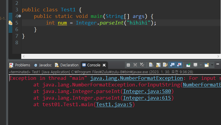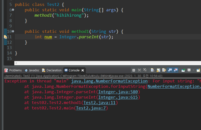 ⇒ NumberFormatException 은 UnChecked Exception 이므로, 처리하지않아도 컴파일 됨.