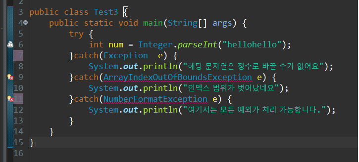 - 상위 타입의 예외가 먼저 선언되는 경우 뒤에 등장하는 catch 블록은 동작할 기회가 없음