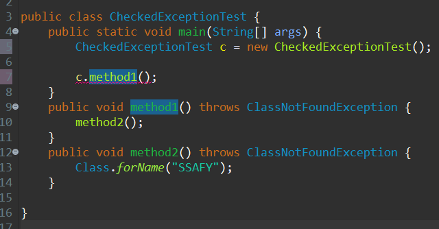 - 예외에 대한 대처코드가 없으면 컴파일이 진행되지 않음