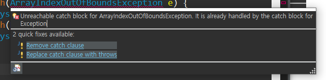 ⇒ 이미 7번라인에서 가장 큰 예외로 처리했으므로, 그 밑에 라인에는 도달할 수 없다는 에러가 발생한다.
