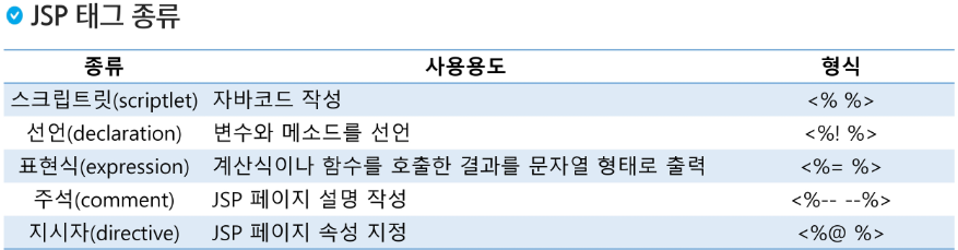 - JSP에서 문서의 내용을 동적으로 생성하기 위해 사용