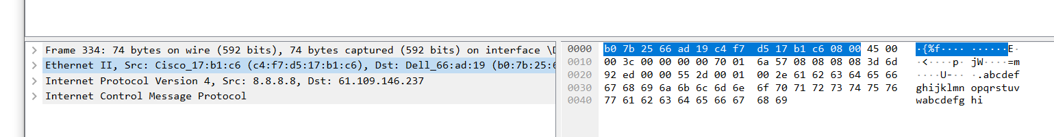 맨 처음 Ethernet 을 확인하면 헤더는 Ethernet 이고 뒤에는 단순히 PAYLOAD 일 뿐이다