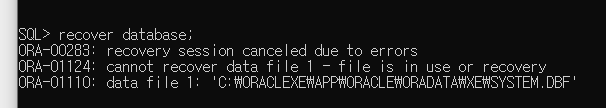 - shutdown abort; → startup; 명령어를 통해 DB를 정상적으로 재기동